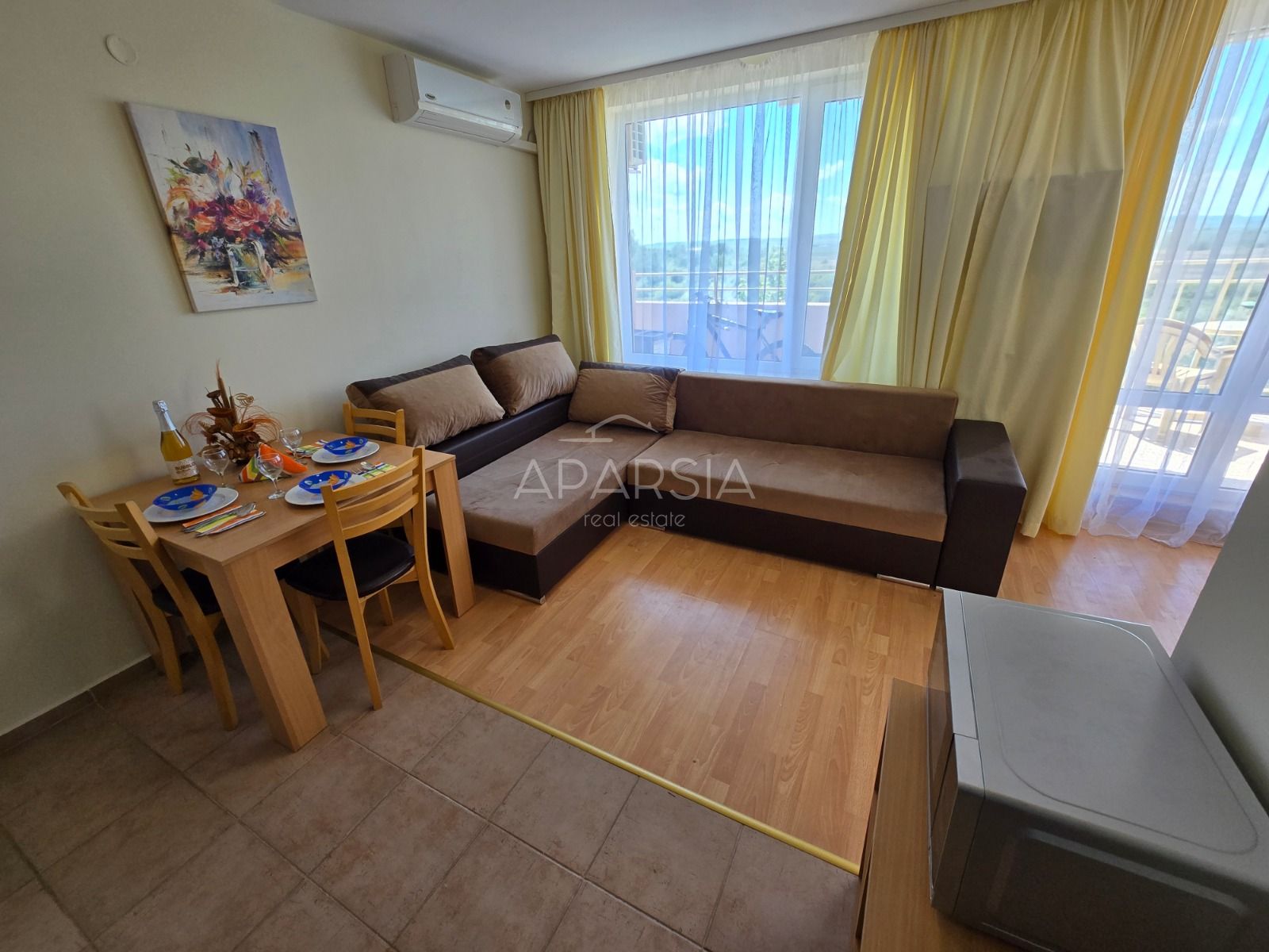 Nabízíme k prodeji zařízený apartmán 2+kk o celkové ploše 60 m² ve 4. patře, jen 700 metrů od pláže, za cenu 72 000 €. Apartmán nabízí příjemné zázemí jak pro vlastní rekreaci, celoroční bydlení, tak i jako investici k pronájmu. Dispozice zahrnuje vstupní chodbu, obývací pokoj s kuchyňským koutem, samostatnou ložnici, koupelnu se sprchovým koutem a toaletou a prostornou terasu s výhledem do zeleně a parkové zóny. Nemovitost se prodává plně zařízená a vybavená nábytkem i spotřebiči, takže je připravena k okamžitému užívání bez dalších větších investic. Roční udržovací poplatek činí 14 € za m², tedy přibližně 840 € ročně. Apartmán se nachází v oblíbeném uzavřeném rezidenčním areálu ve Slunečném pobřeží, který je velmi dobře udržovaný a nabízí komfortní zázemí pro majitele i hosty. K dispozici je recepce, restaurace a bar, několik bazénů pro dospělé i děti, podle dostupných informací až šest bazénů pro dospělé a dětský bazén, dále obchody, supermarket, dětská hřiště, sportovní zóny, venkovní fitness, tenisové kurty, mini golf, fotbalové a volejbalové plochy, sauna, masáže, kosmetické služby, směnárna, prádelna i parkování. Výhodou je také poloha poblíž aquaparku a dobrá dopravní dostupnost. Slunečné pobřeží patří k nejznámějším letoviskům na bulharském pobřeží Černého moře. Je známé širokou písečnou pláží, bohatou občanskou vybaveností a živou atmosférou, především v centrální části, zároveň však tato konkrétní poloha leží mimo nejrušnější centrum, takže nabízí klidnější prostředí pro odpočinek i pohodlnější pobyt mimo hlavní sezónní ruch. V okolí najdete restaurace, obchody, zastávky i další služby potřebné pro sezónní i trvalé bydlení. Letiště v Burgasu je vzdálené přibližně 25 až 27 km, cesta autem trvá zhruba 25 minut. Tato nemovitost je ideální volbou pro ty, kteří hledají praktický, plně vybavený apartmán v oblíbené přímořské lokalitě s výborným zázemím a dobrou dostupností pláže i služeb. Na nemovitosti v zahraničí se díváme trochu jinak – místo omezených „balíčků“ vám šijeme řešení na míru a díky síti prověřených partnerů v realitách se dostáváme k široké škále nemovitostí, které běžně neuvidíte v klasické nabídce; mechanismus je jednoduchý: řeknete nám své představy – preferovanou lokalitu, cenové rozpětí, velikost a způsob využití – a my se pustíme do systematického hledání. APARSIA s.r.o. – váš specialista na nemovitosti v zahraničí; pro více informací nebo domluvení prohlídky nás kontaktujte na telefonu +420 702 138 072 nebo e-mailem na info@aparsia.cz.