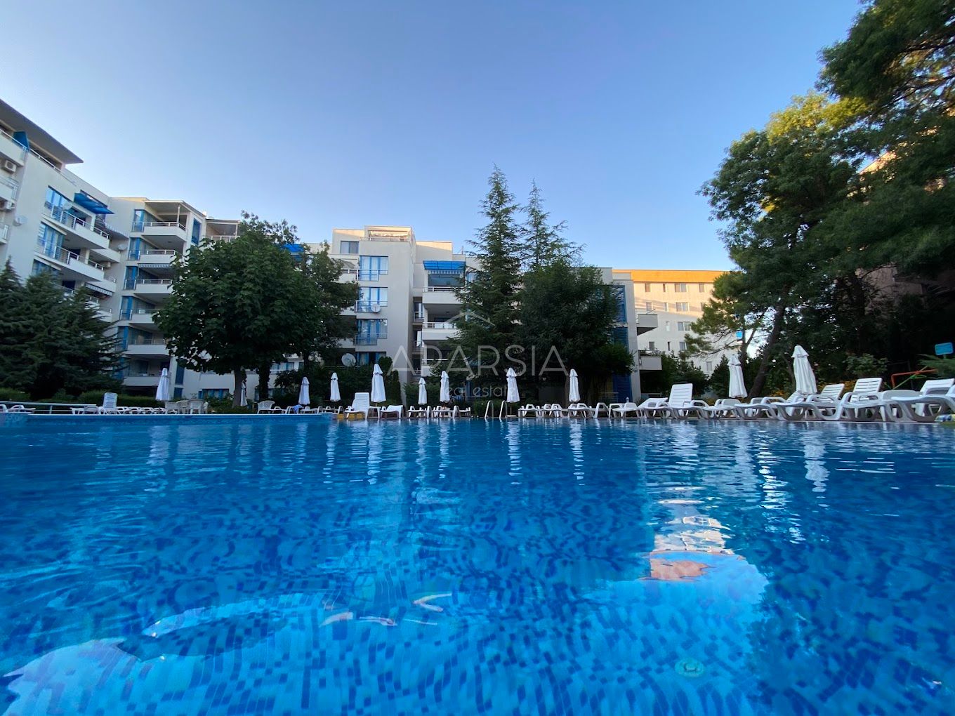 Součástí komplexu Excelsior (Excelsior Holiday Apartments Sunny Beach) je udržovaná zahrada a zázemí, které ocení rodiny i investoři – k dispozici jsou bazény (včetně dětského), sluneční terasa, bar, minimarket, dětské hřiště a také výtah a celodenní ostraha, což přináší pohodlí i pocit bezpečí během pobytu. Velkou výhodou je, že z areálu máte přímý přístup k moři a na písek jste doslova za pár kroků, zároveň ale můžete využívat bazén a klidnější atmosféru v rámci uzavřeného komplexu.
